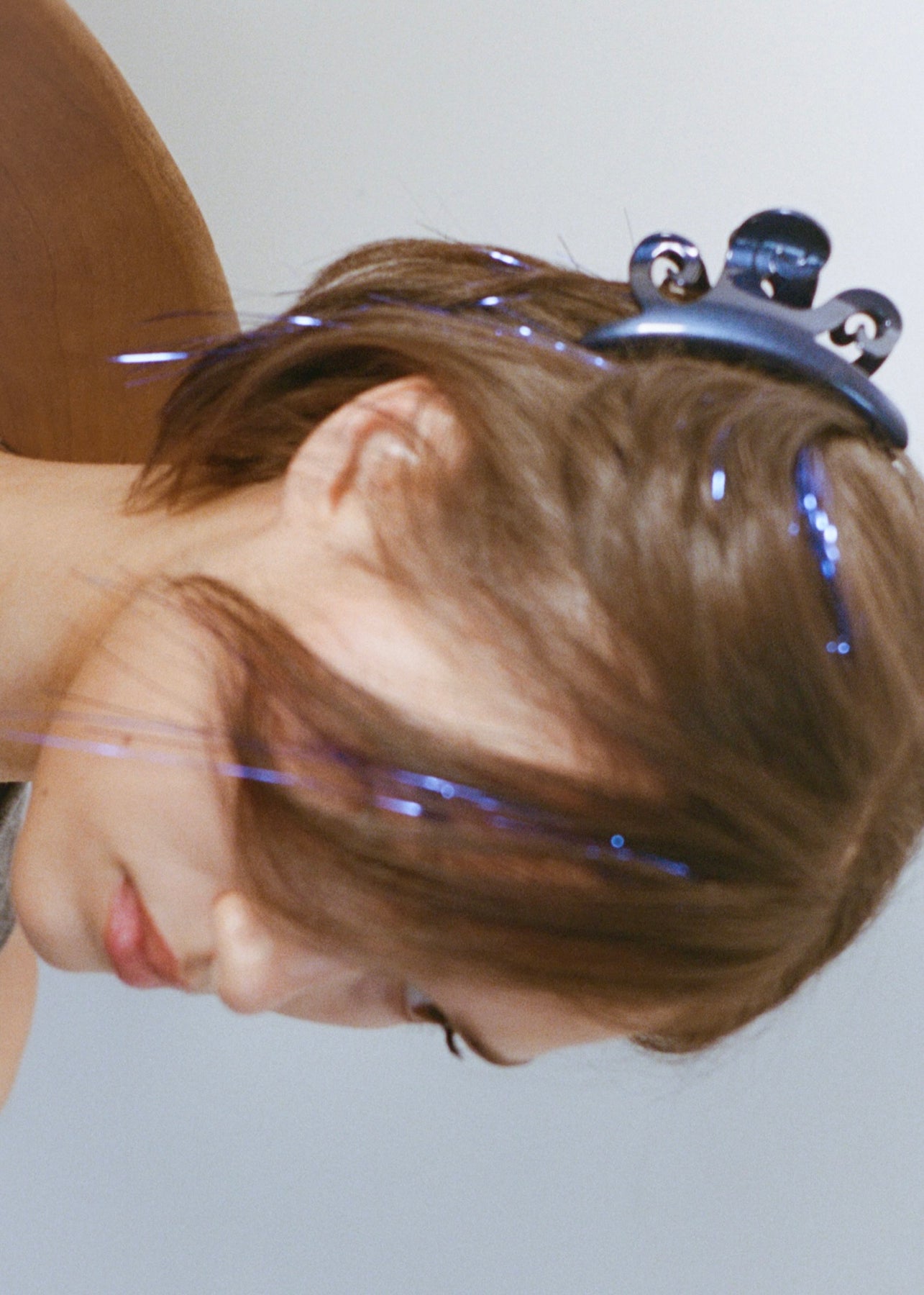 Sculptural and functional, the River claw clip is crafted in France from molded cellulose acetate. Its glossy finish gives the surface a soft, satin-like sheen, while a patented covered-spring mechanism ensures a secure and seamless grip.