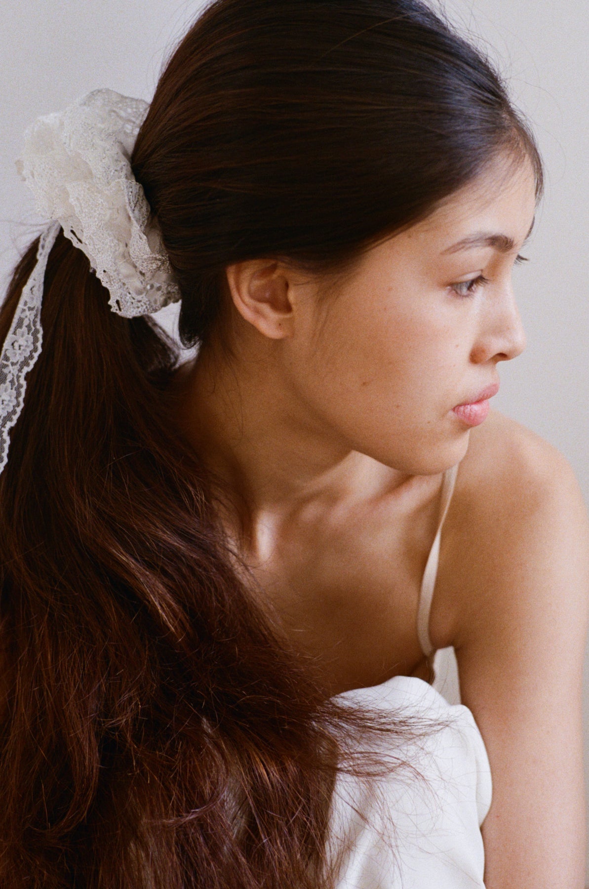 Each scrunchie is finished with our signature detachable lace ribbon, versatile and playfully refined. Weave it through a braid, knot it around a ponytail, or wear it on its own as a subtle statement.