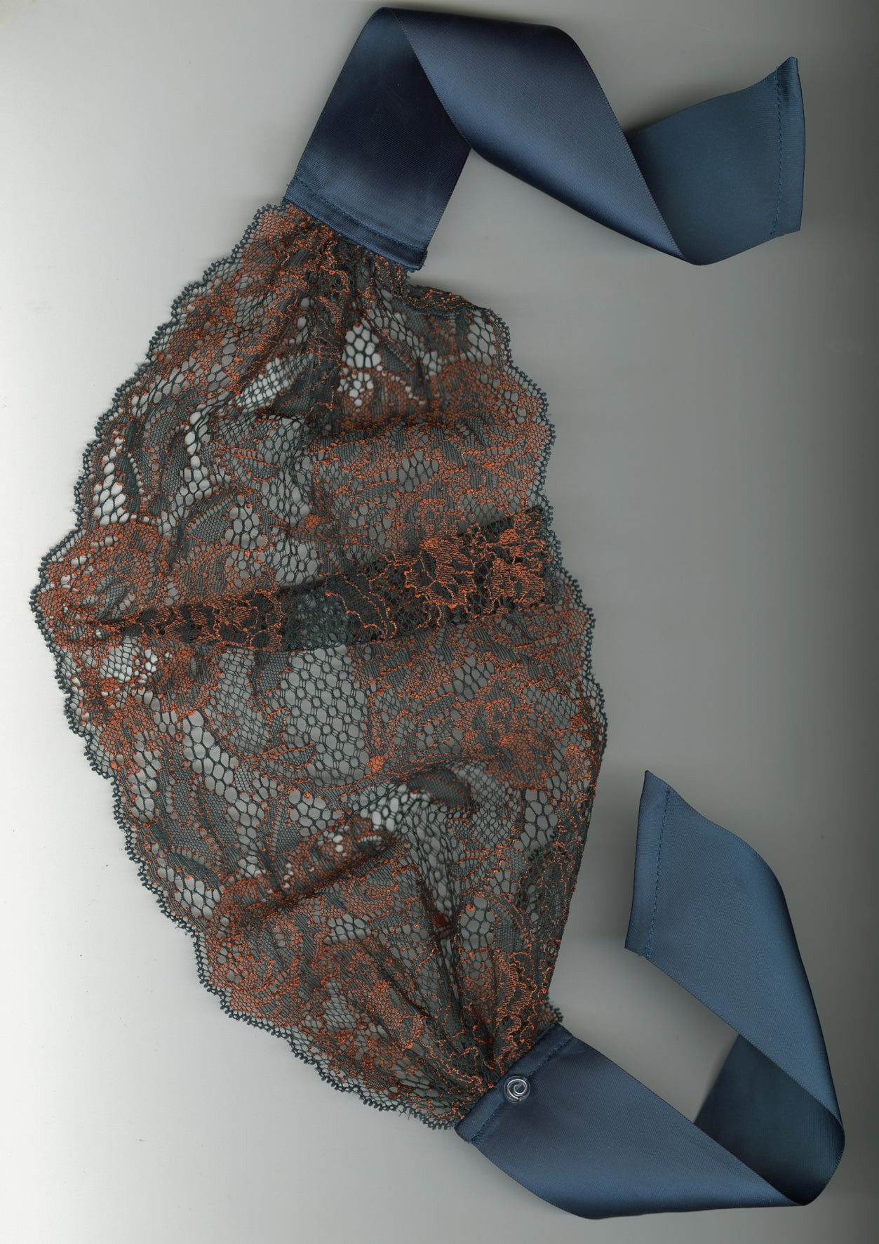 Crafted in Paris from soft French lace, this navy and orange headband is delicately gathered onto a smooth satin ribbon, offering both comfort and adjustability.