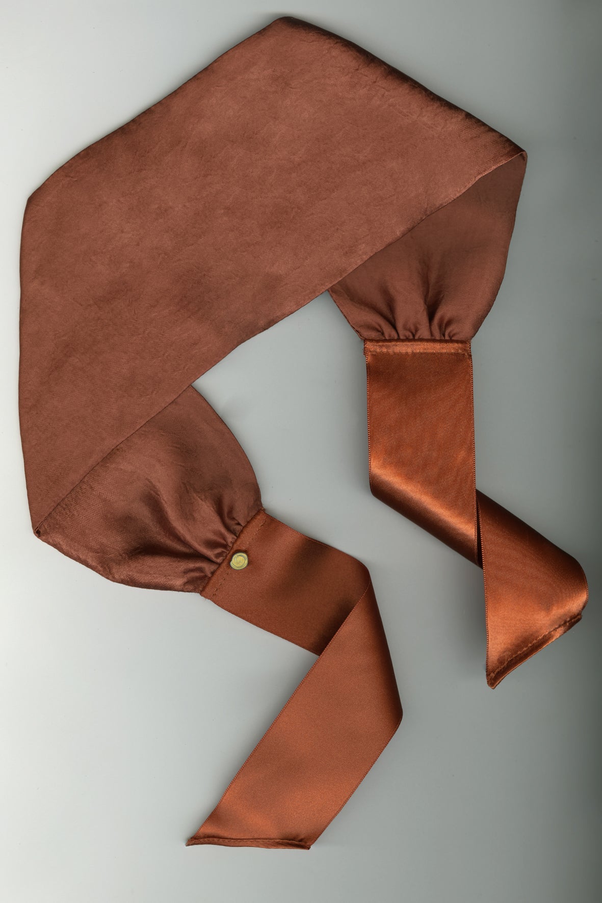 Crafted in Paris, this silky rust coloured headband is delicately gathered onto a smooth satin ribbon, offering both comfort and adjustability.