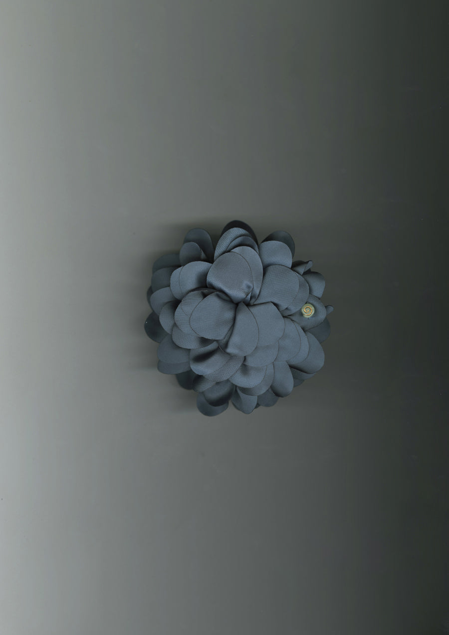 Inspired by the graceful bloom of a dahlia, this scrunchie is hand-formed from lustrous steel blue satin into softly layered petals that wrap delicately around the hair.