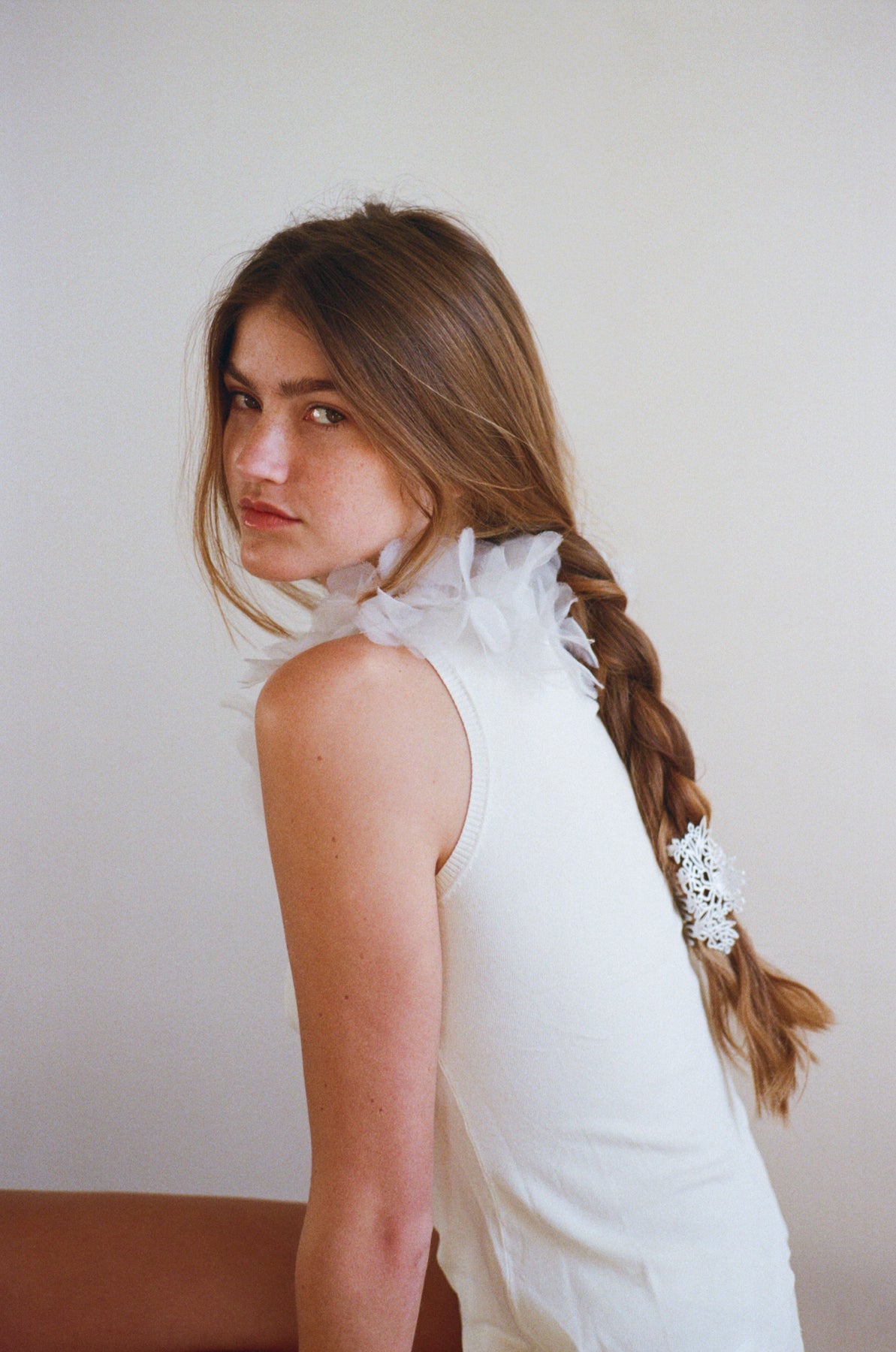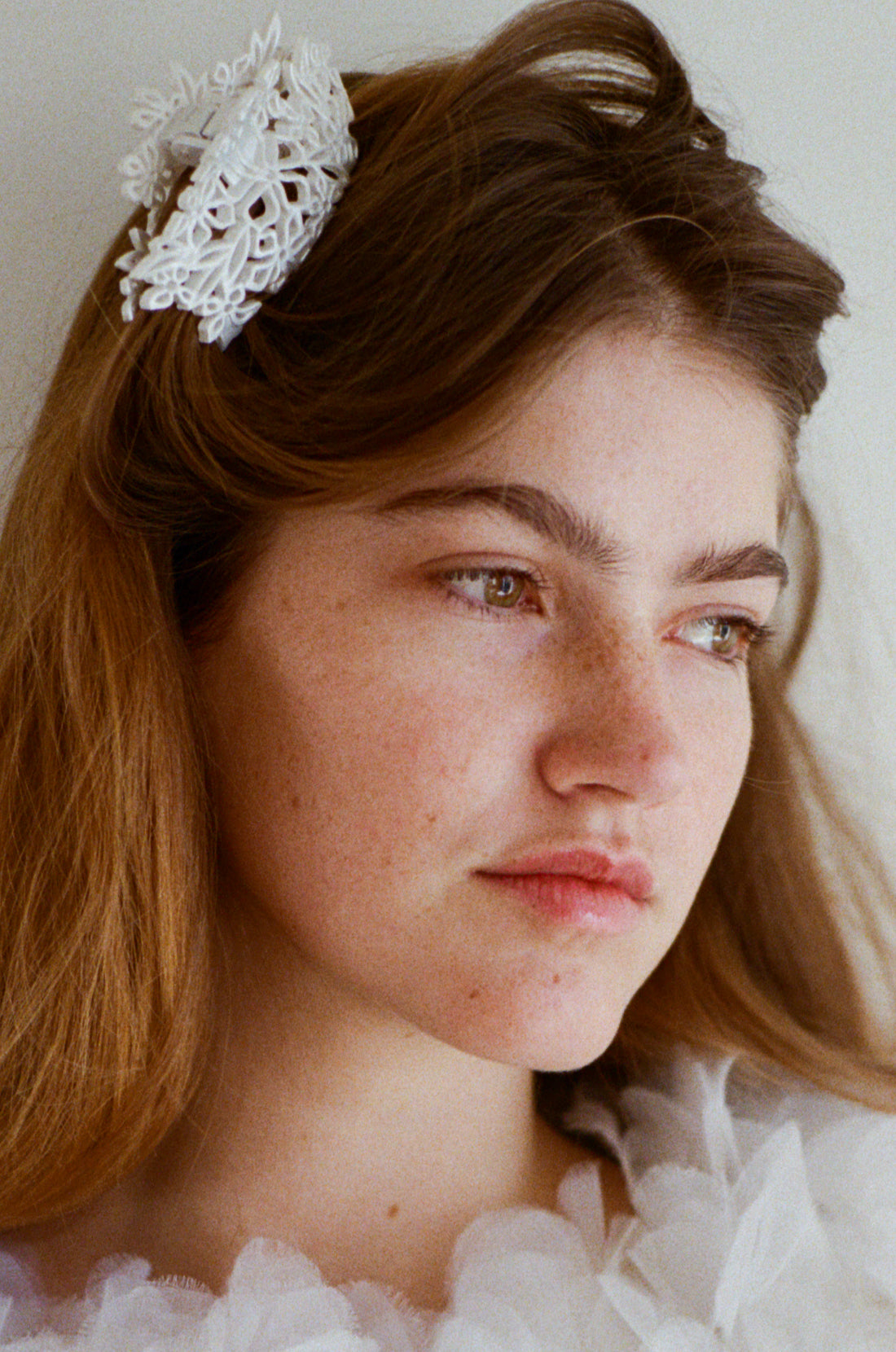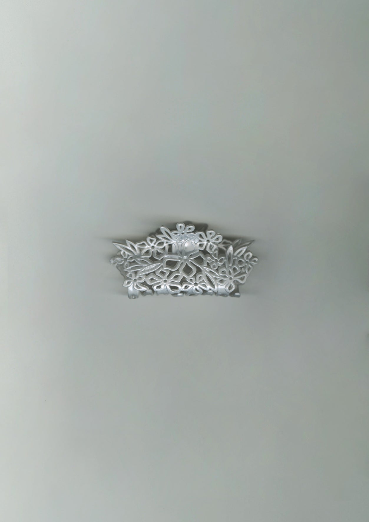 This romantic lace-patterned claw clip in a pearly white is sculpted from cellulose acetate in an intricate openwork design. Delicate florals and fine cutouts create a light, airy structure that frames the hair rather than covering it.