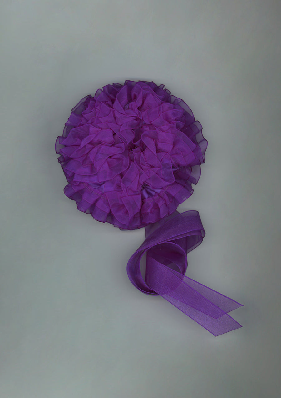 Delicate and gracefully sculpted, this bright purple ruffled organza scrunchie evokes the sculptural beauty of layered petals. Our Mauve is handcrafted in Paris from sheer organza.